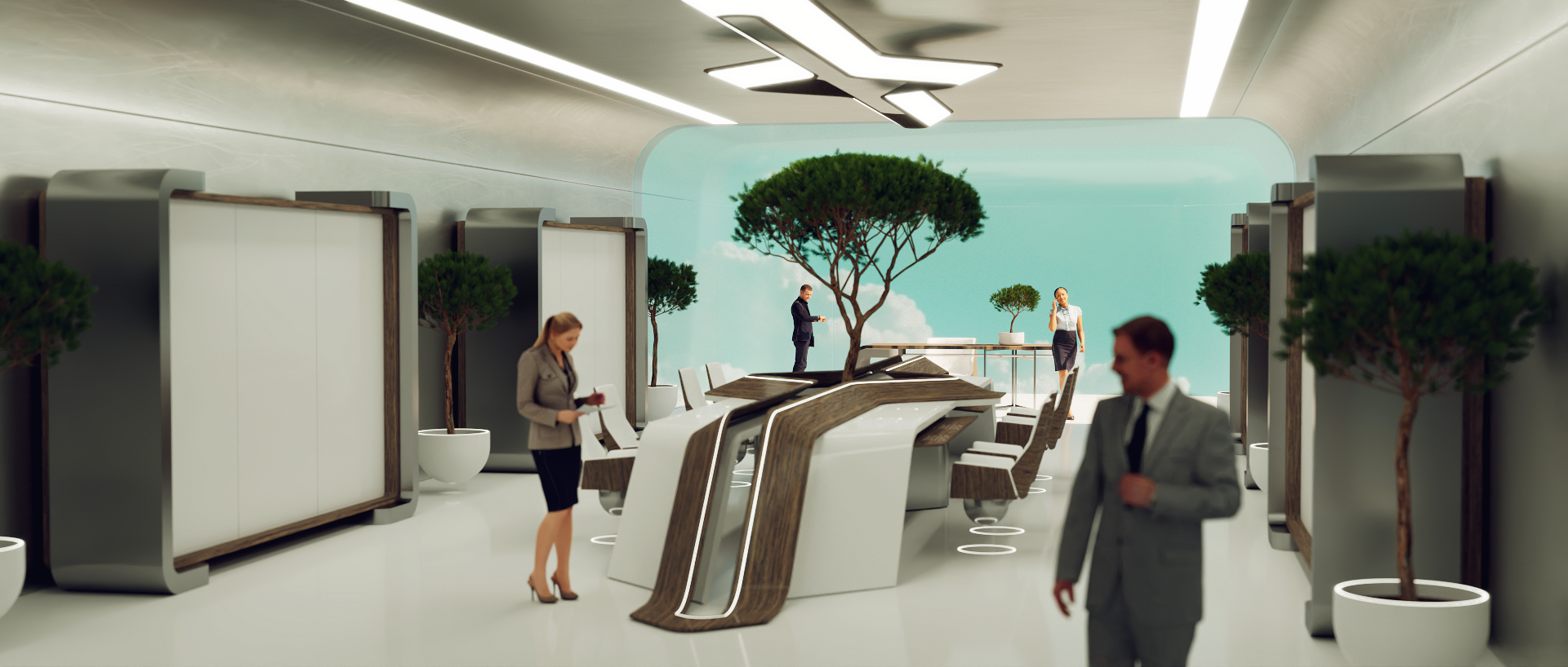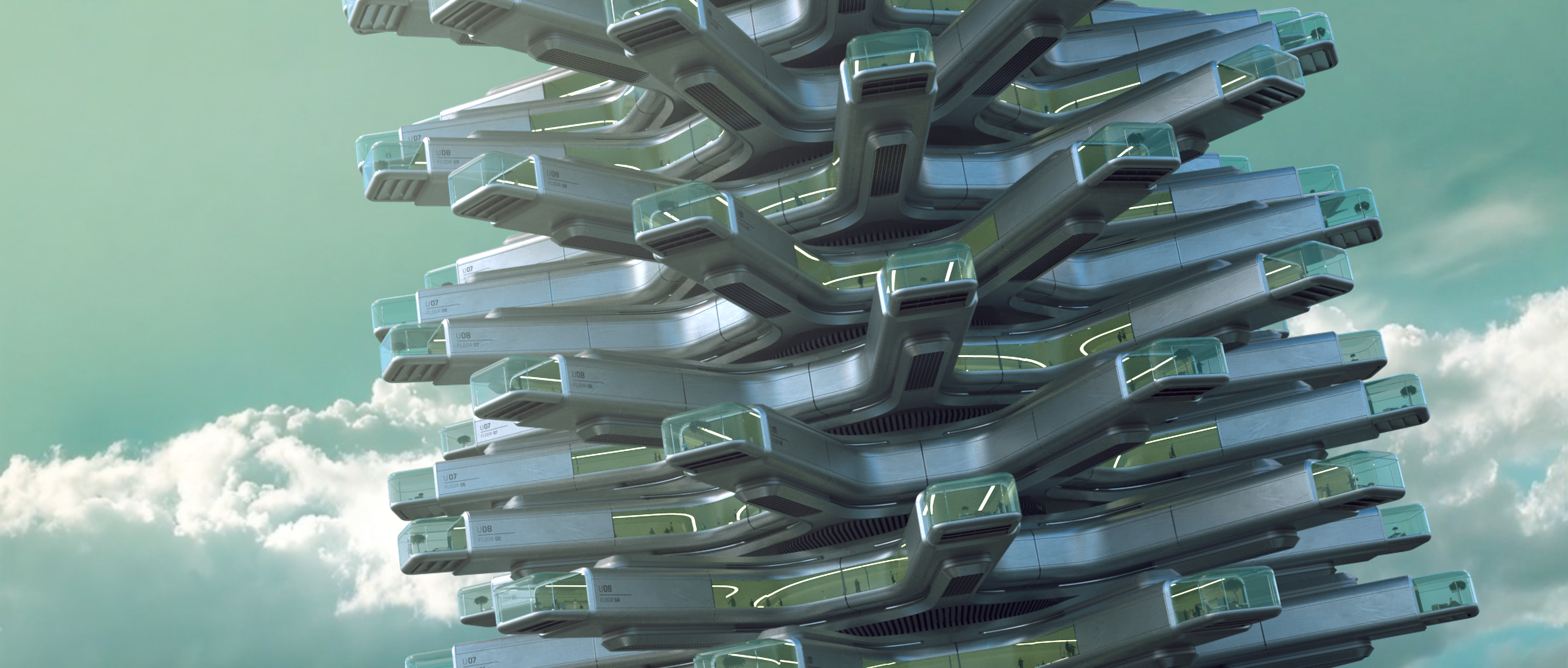 A futuristic office tower envisioned for 2050, rising beneath a green-teal sky shaped by heavy pollution. Each floor is capable of independent rotation, optimizing orientation and panoramic views throughout the day. Integrated air-filtration systems supply clean, breathable air to every level, allowing people to go to work each day in a safe, healthy environment while enjoying breathtaking scenery. The building becomes an active response to its surroundings and a symbol of adaptive, resilient architecture.